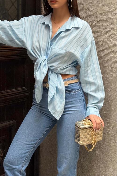 Modern ve güçlü bir duruş sunan bu oversize gömlek, çizgili deseniyle zamansız bir stil oluşturur.