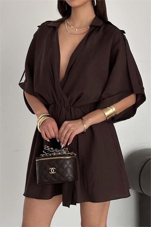 Belden büzgülü yapısı sayesinde vücut hatlarını dengeli şekilde sararken, V yaka formu feminen bir görünüm kazandırır. Apolet detaylı kolları ile modern ve dikkat çekici bir duruş sağlar.