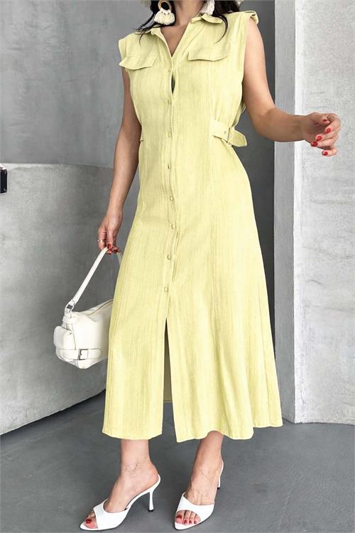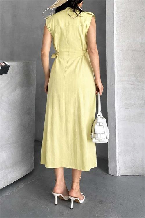 Ön kısmında yer alan boydan düğme detayı elbiseye klasik ve zamansız bir görünüm kazandırırken, omuzlardaki apolet tasarımı güçlü ve stil sahibi bir duruş sağlar. Göğüs kısmındaki kapaklı cepler modern bir dokunuş katarken, yan kısımdaki toka bağlama detayı bel formunu zarif şekilde ortaya çıkarır.