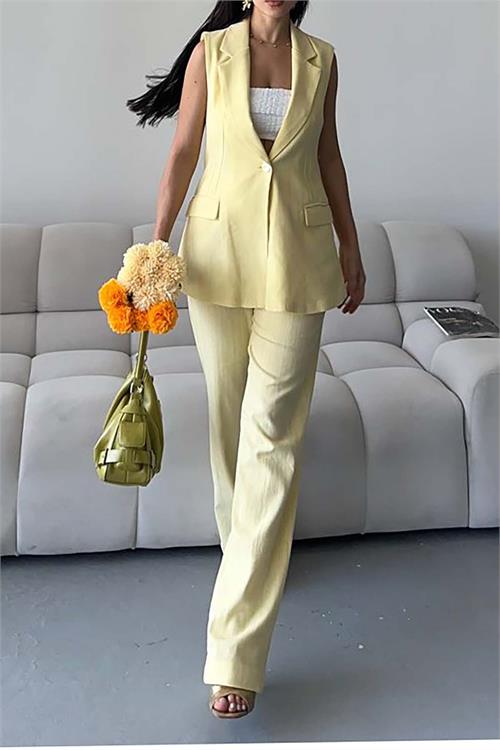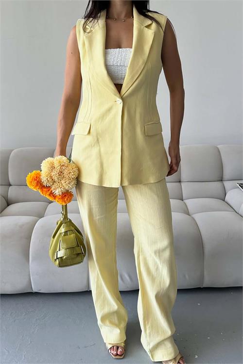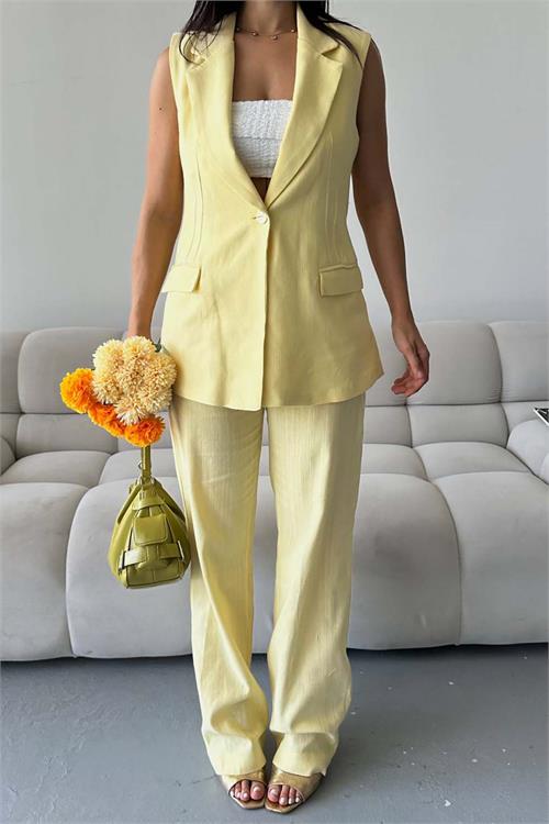 Kadın Sarı Keten Kumaş Cepli Pantolon & Cep Kapaklı Blazer Yelek İkili Takım HSZ052