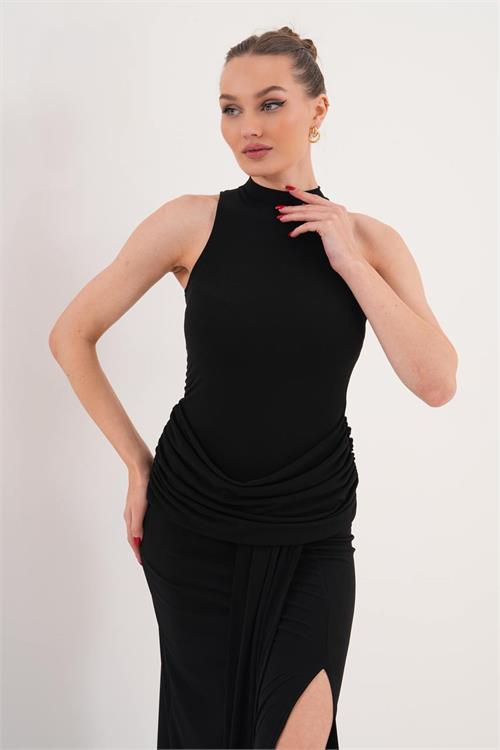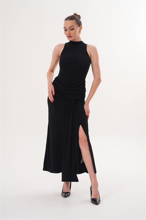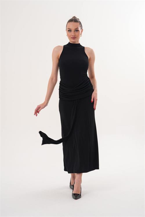 Bel kısmındaki drape detayları vücut hatlarını dengelerken, etek kısmındaki kuyruk detayı elbiseye hareket ve zarafet katar. Yüksek yaka tasarımı ile modern ve güçlü bir stil sunar. Özel davetler ve şık kombinler için ideal bir tercihtir.