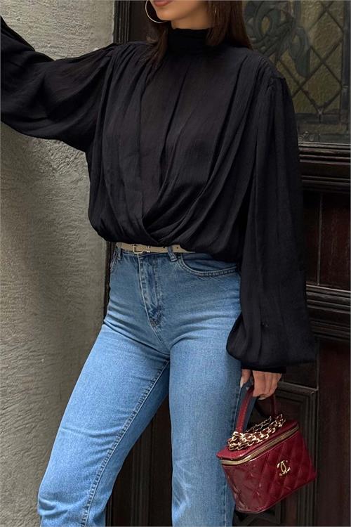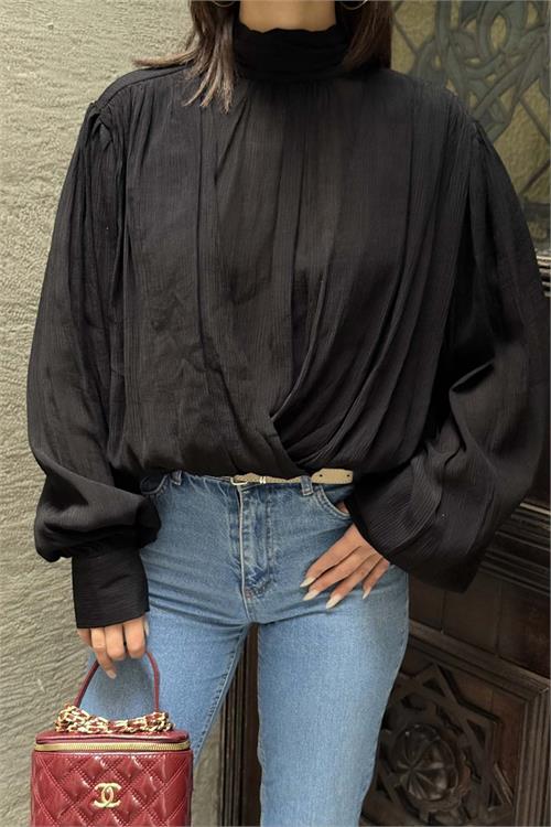 Kadın Siyah Drapeli Modal Bluz Balıkçı Yaka Uzun Kollu HSZ058