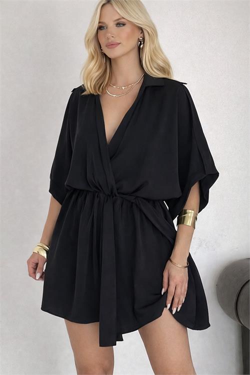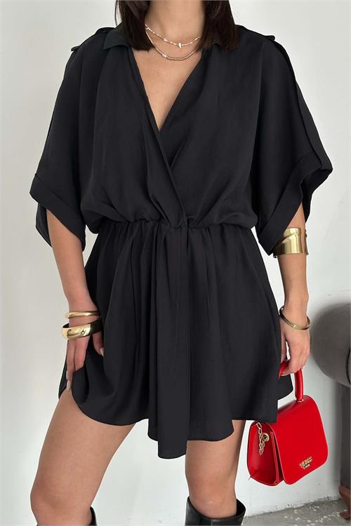 Kadın Siyah Modal Kumaş V Yaka Belden Büzgülü Apolet Detaylı Mini Elbise HSZ054