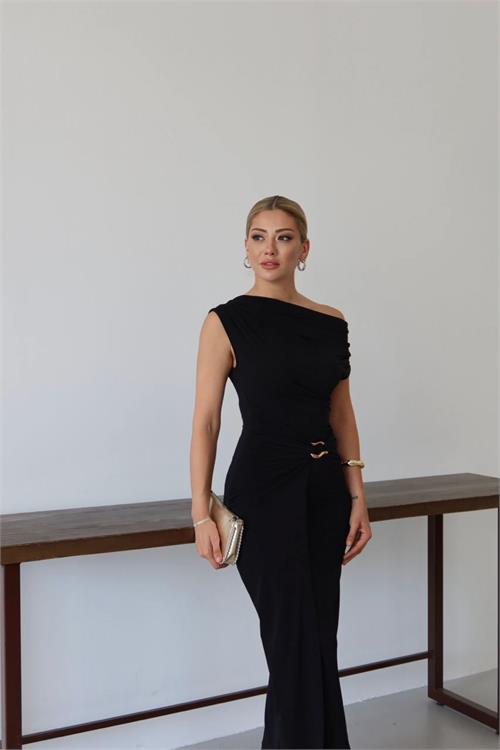 Bel kısmında yer alan büzgü detayı ile form kazanan tasarım, gold toka aksesuar ile birleşerek ürüne güçlü ve sofistike bir görünüm kazandırır. Bu detay, hem vücut hatlarını zarif şekilde ön plana çıkarır hem de elbiseye hareketli ve dikkat çekici bir karakter katar.