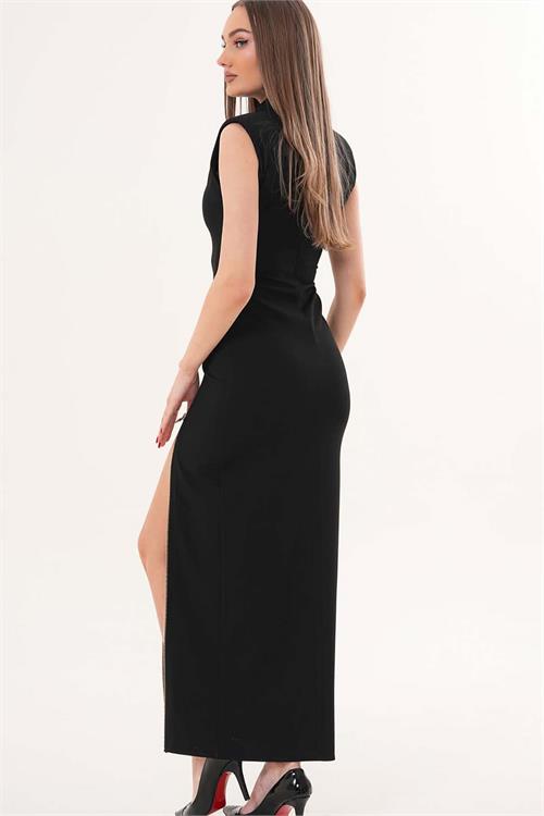 Modern ve iddialı tasarımıyla öne çıkan bu uzun elbise, güçlü siluetiyle dikkat çeker.