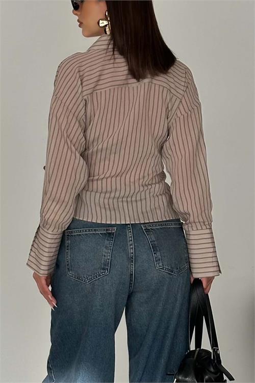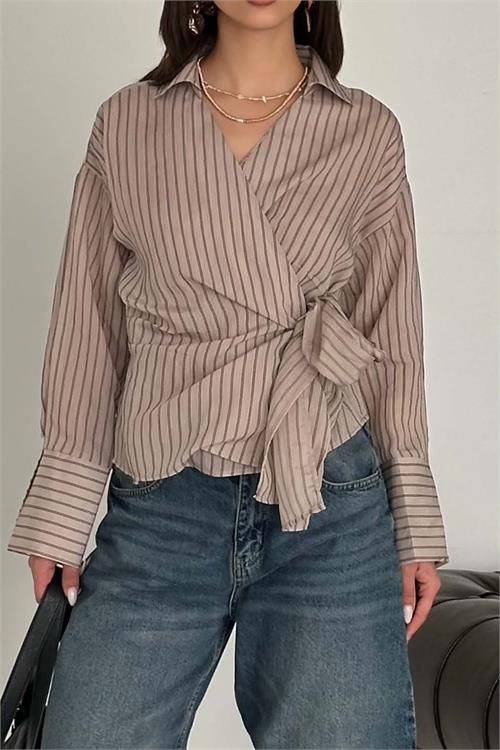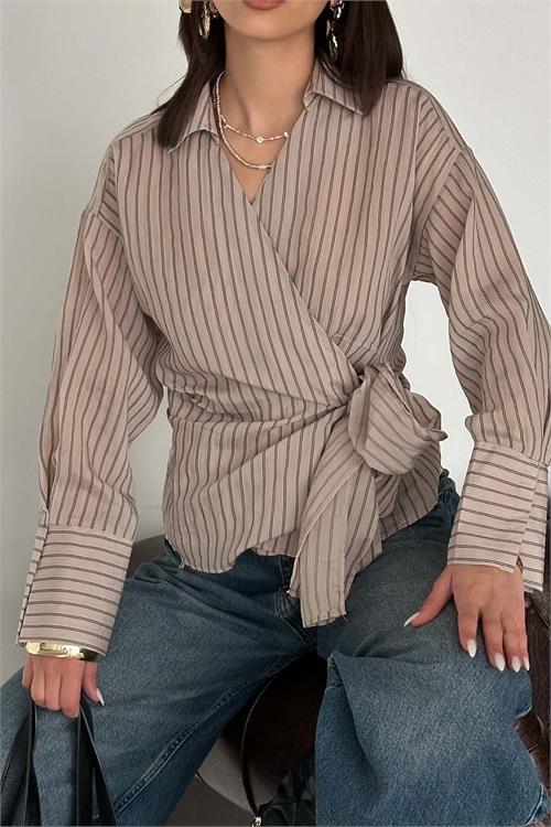 Kadın Vizon Çizgili Kruvaze Yandan Bağlamalı Gömlek HSZ055