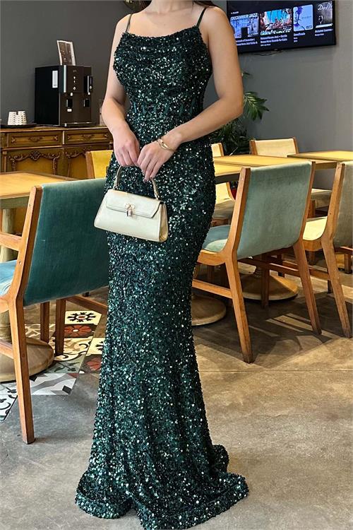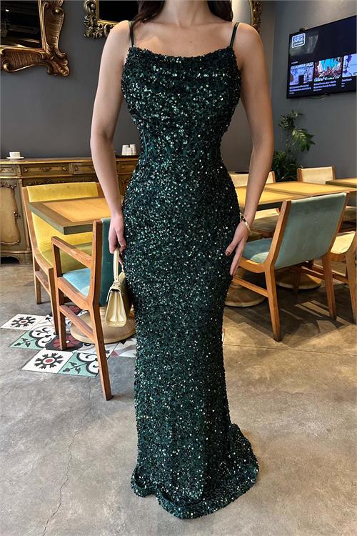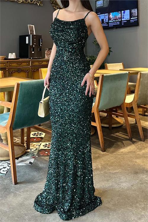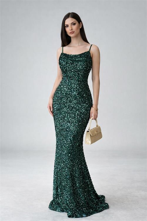 Göz alıcı işıltıya sahip bu pul payet abiye elbise, vucudu saran kesimi ile zarif ve feminen bir siluet sunar. Askılı tasarimi modern bir gorunum kazandirirken, balik formu sayesinde sik ve iddiali bir durus saglar.