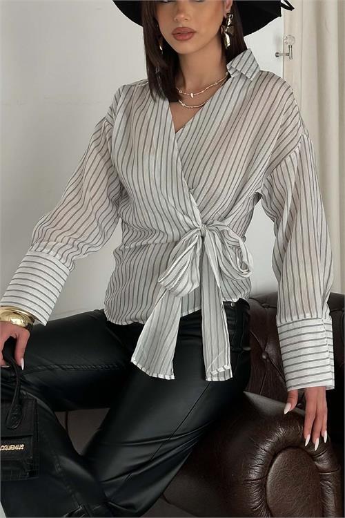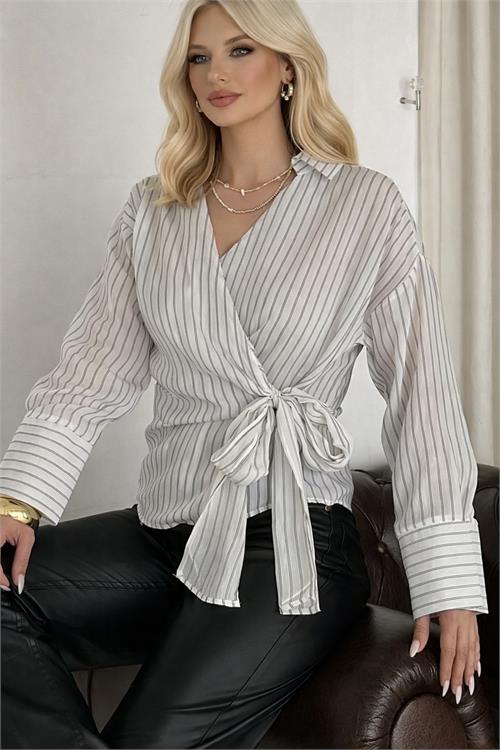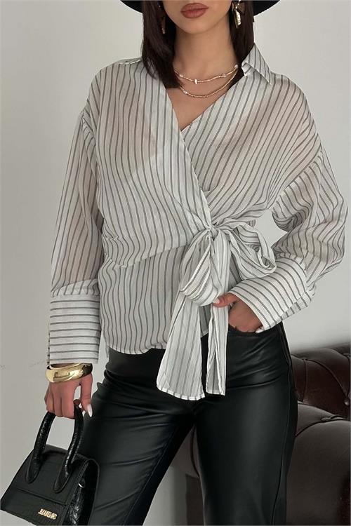 Modern ve zarif çizgili tasarımıyla öne çıkan bu kruvaze gömlek, yandan bağlamalı detayıyla stilinize hareket katar.