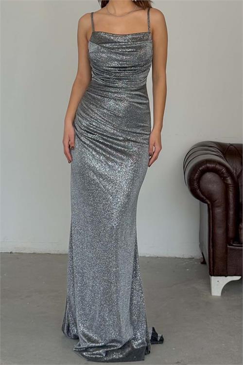 Zarif ve feminen bir siluet sunan bu uzun abiye elbise, simli likralı orme kumasi ile ışıltılı bir gorunum kazandırır. Esnek yapısı sayesinde vucudu nazikce sarar ve gun boyu konfor saglar.