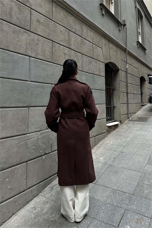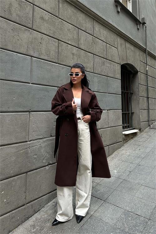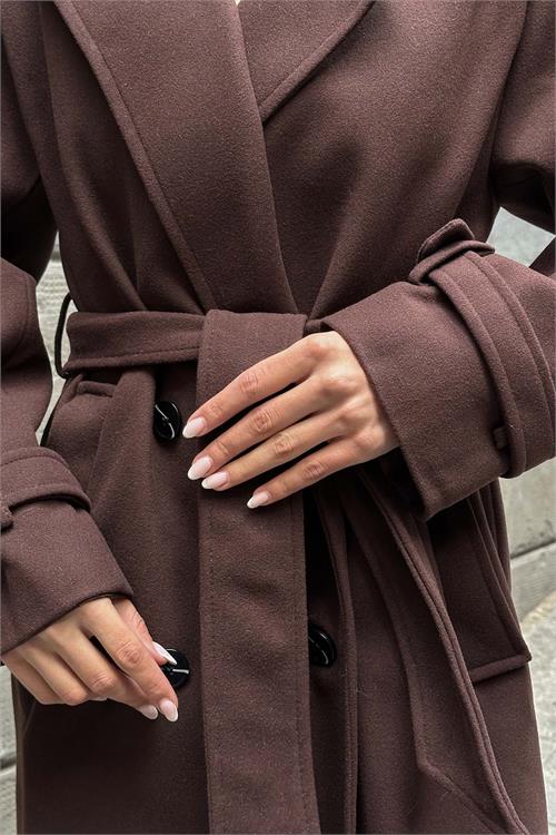 Kadın Kahve Kuşaklı Kruvaze Yaka Uzun Kaşe Kaban HSZ001