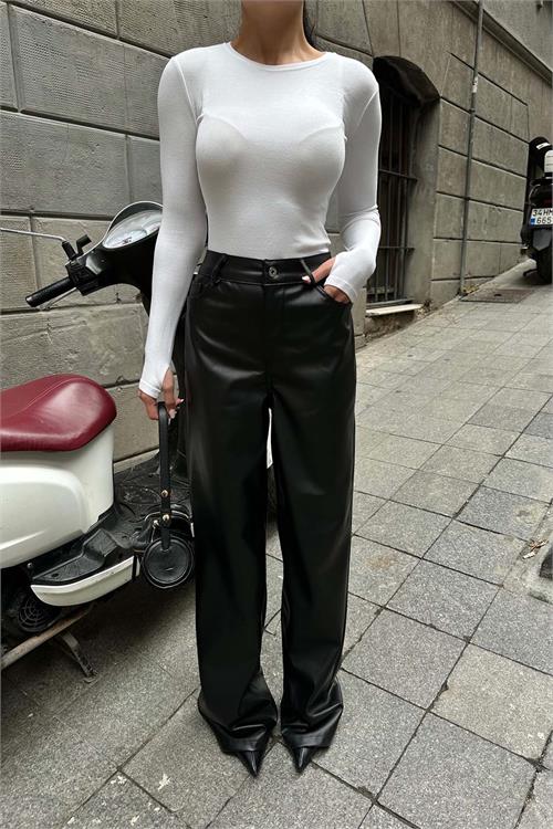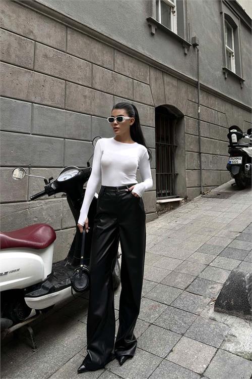 Şıklığı ve konforu bir arada sunan kadın siyah yüksek bel bol paça deri pantolon, modern kesimi ve likralı yapısıyla gün boyu rahat kullanım sağlar. Yüksek bel formu vücudu toparlarken, bol paça kesimi zarif ve trend bir siluet oluşturur.