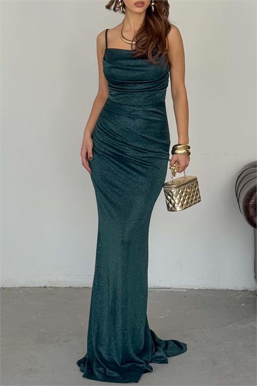 Zarif ve feminen bir siluet sunan bu uzun abiye elbise, simli likralı orme kumasi ile ışıltılı bir gorunum kazandırır. Esnek yapısı sayesinde vucudu nazikce sarar ve gun boyu konfor saglar.